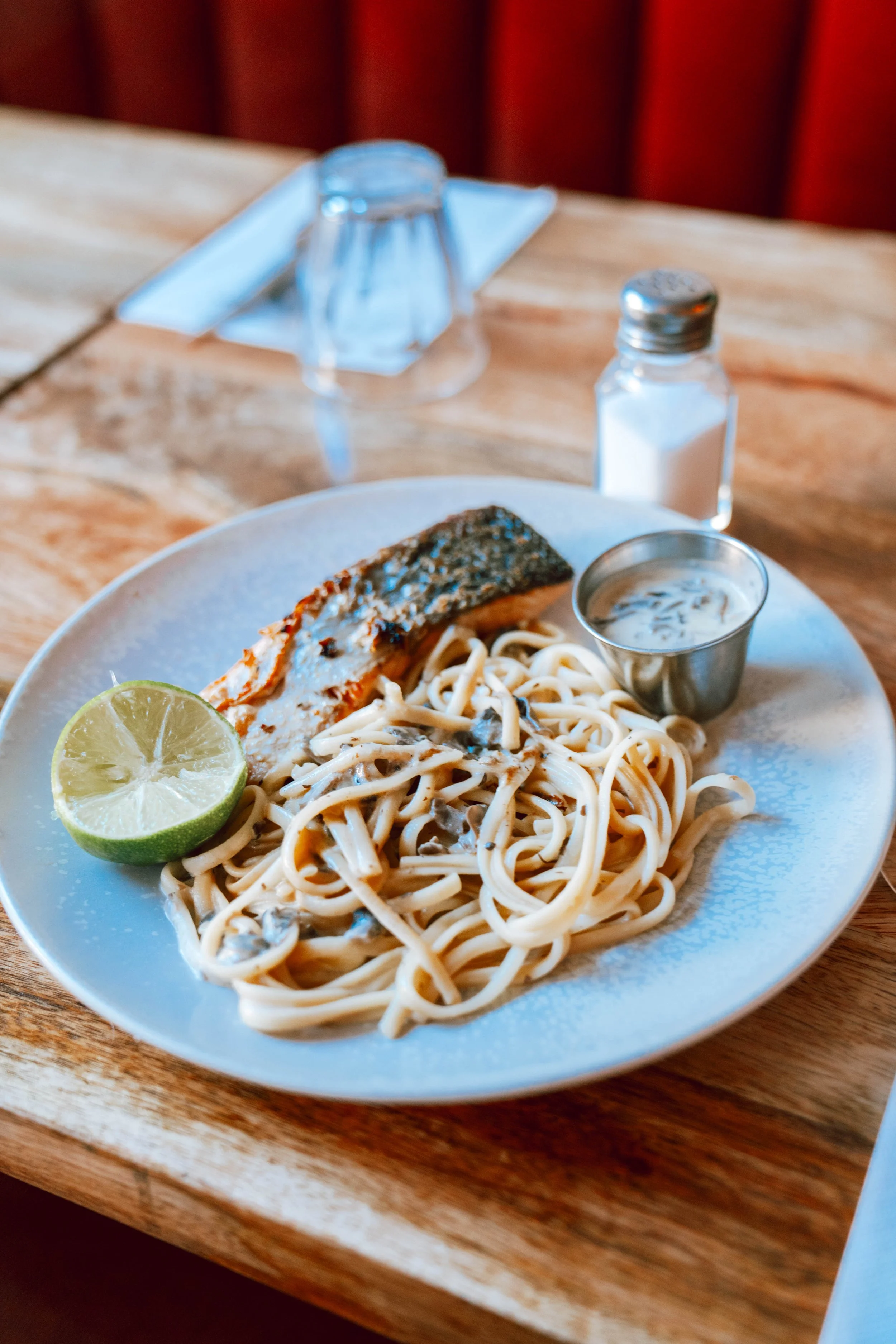 Tagliatelle, saumon, sauce à la crème et citron frais.