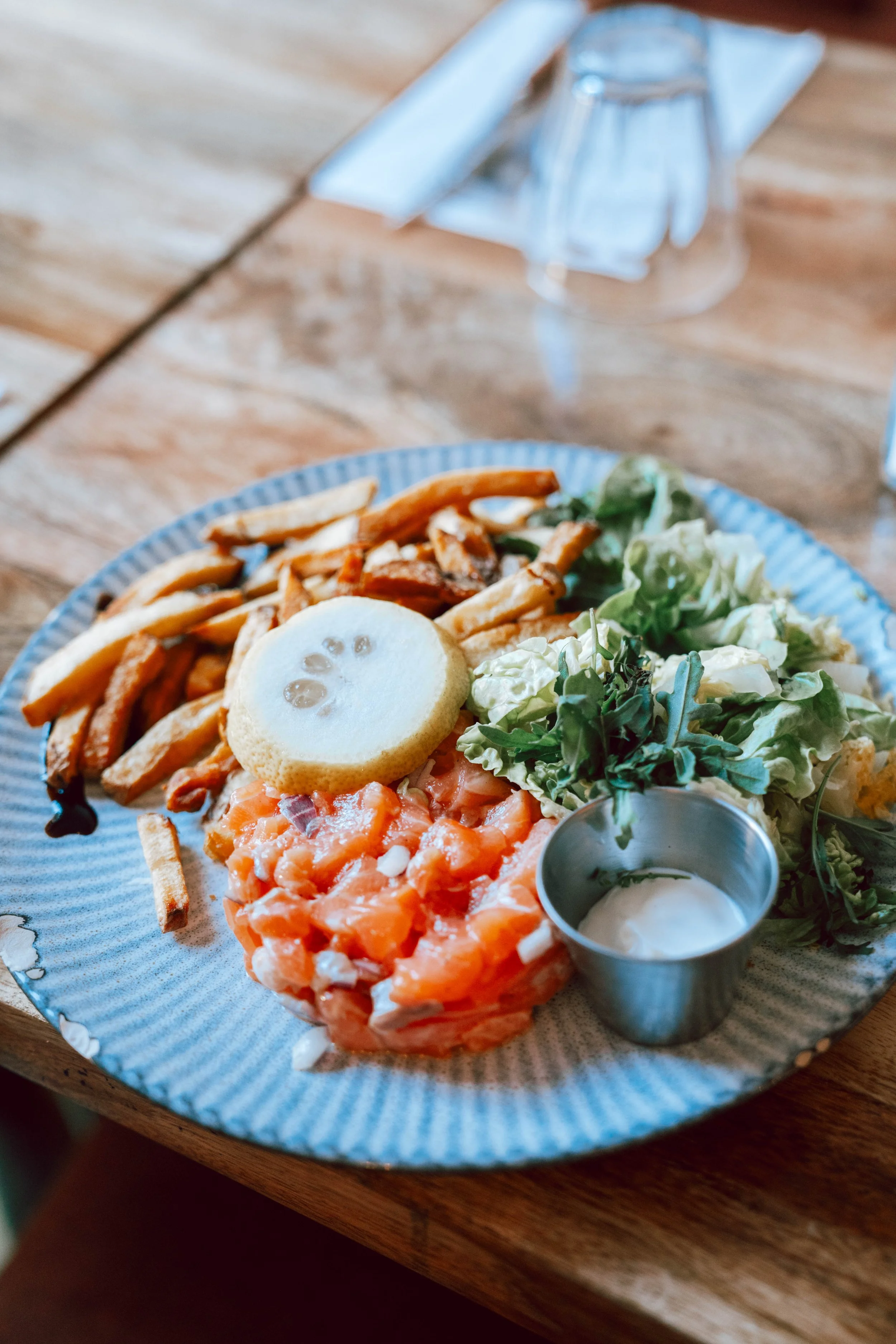 Salade verte, saumon fumé, tomates cerises, roquette, citron, oignons rouges, sauce blanche et crème balsamique.