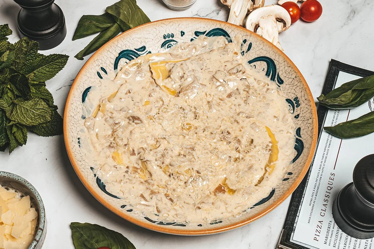 Raviolis farcis aux cèpes, sauce crème, champignons de Paris et Grana Padano DOP.