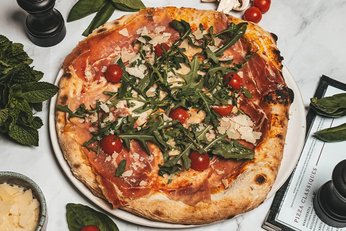 Sauce tomate, mozzarella fior di latte, jambon de Parme, tomates cerises, roquette et copeaux de Grana Padano DOP.