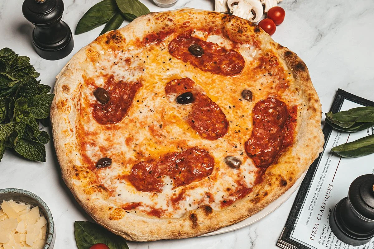 Sauce tomate, mozzarella fior di latte, spianata piccante (chorizo italien piquant) et olives.