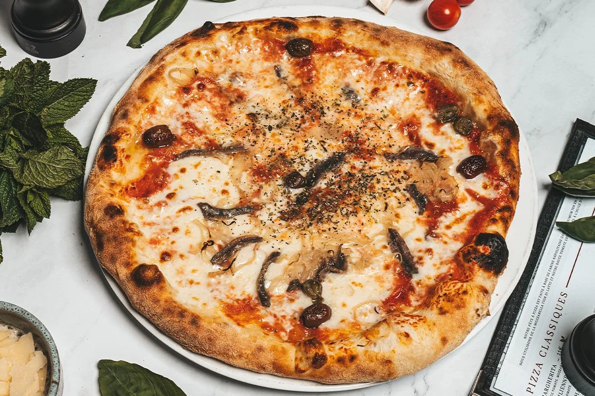 Sauce tomate, mozzarella fior di latte, anchois, olives, oignons et câpres.