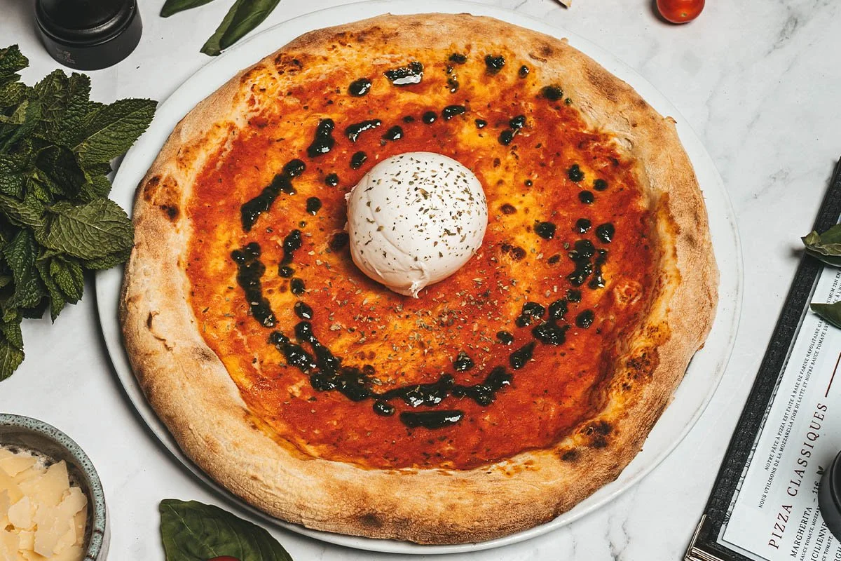 Sauce tomate, mozzarella di bufalo AOP fraîche, pointe de pesto maison